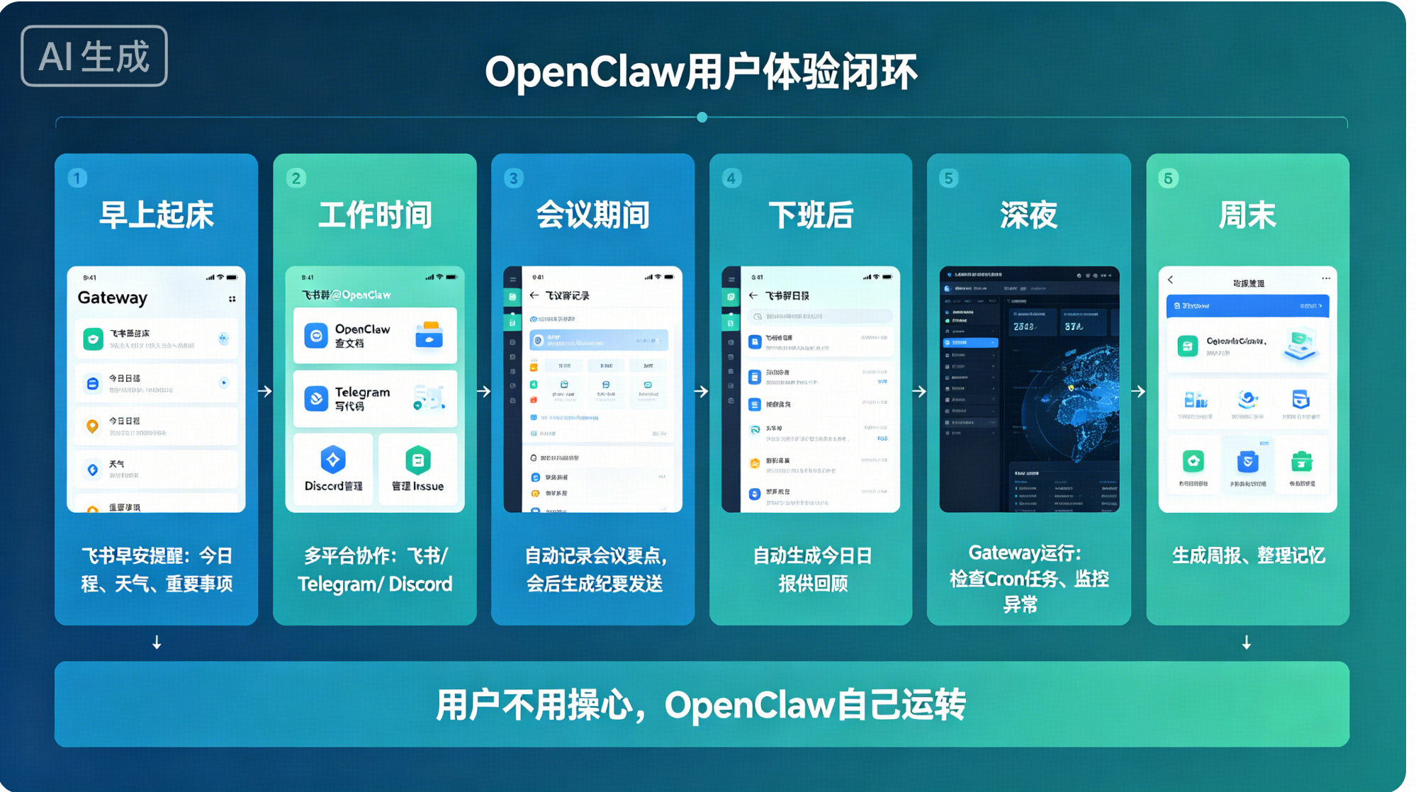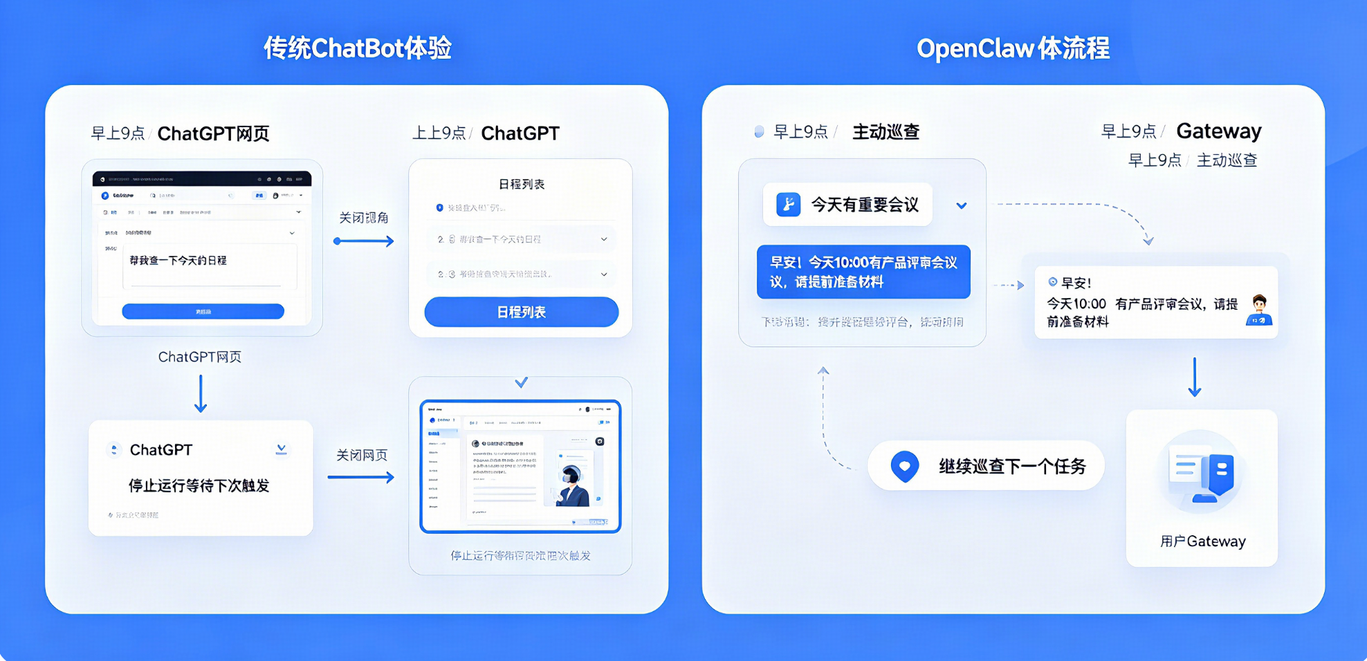 | 需要人工触发 | 每次都要打开应用、输入指令 | Gateway心跳巡查,主动执行 | 省时间、不遗漏 |