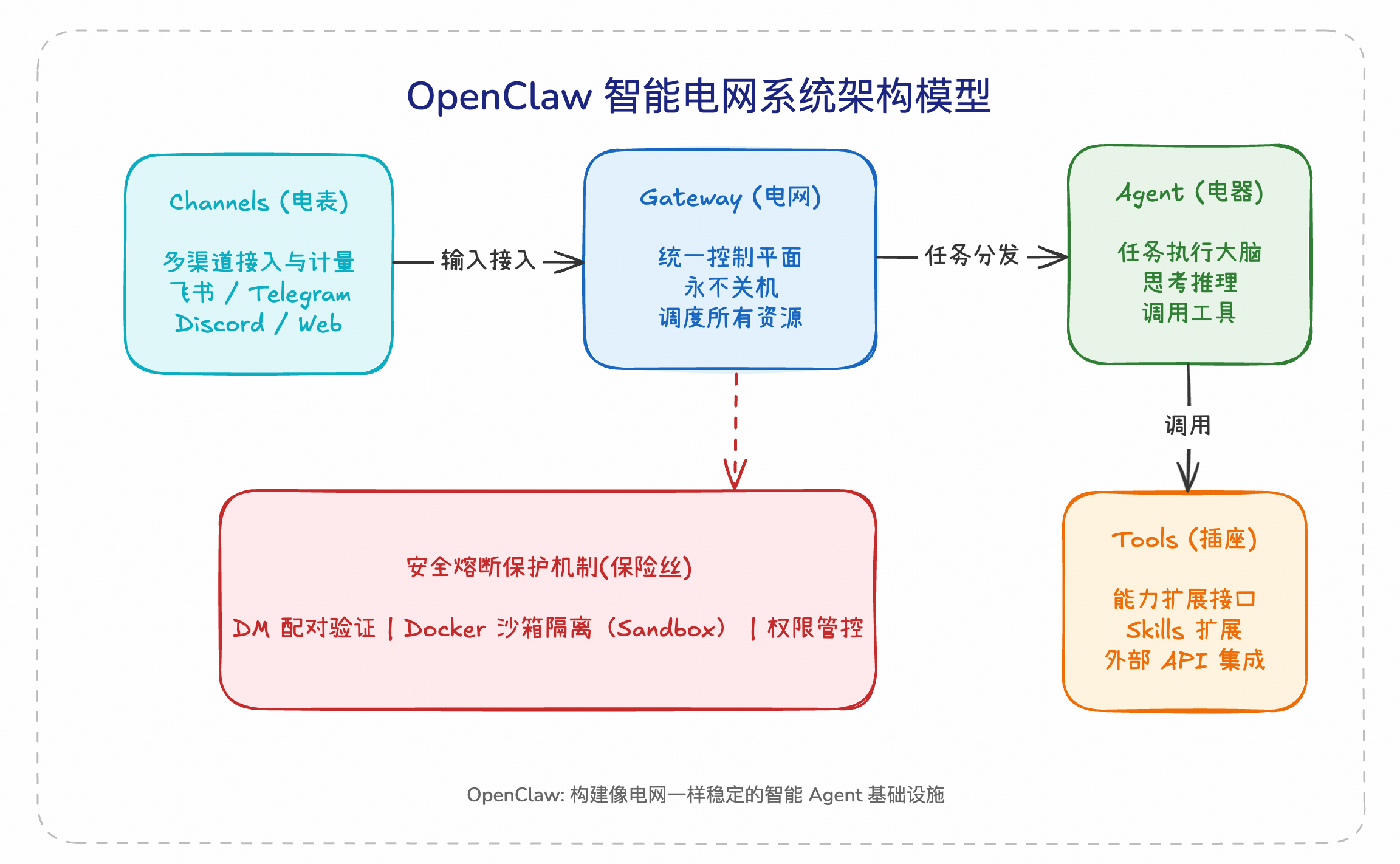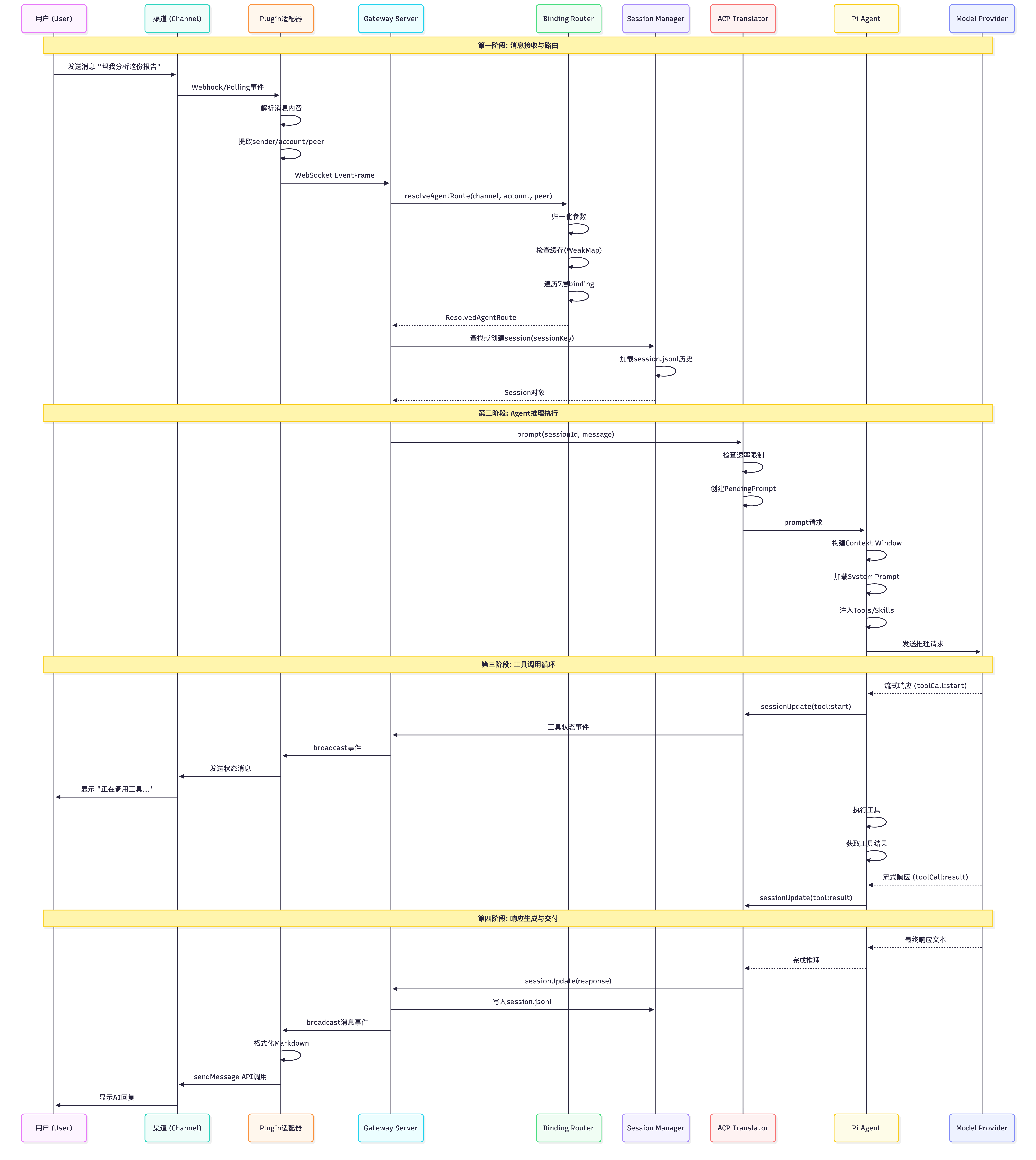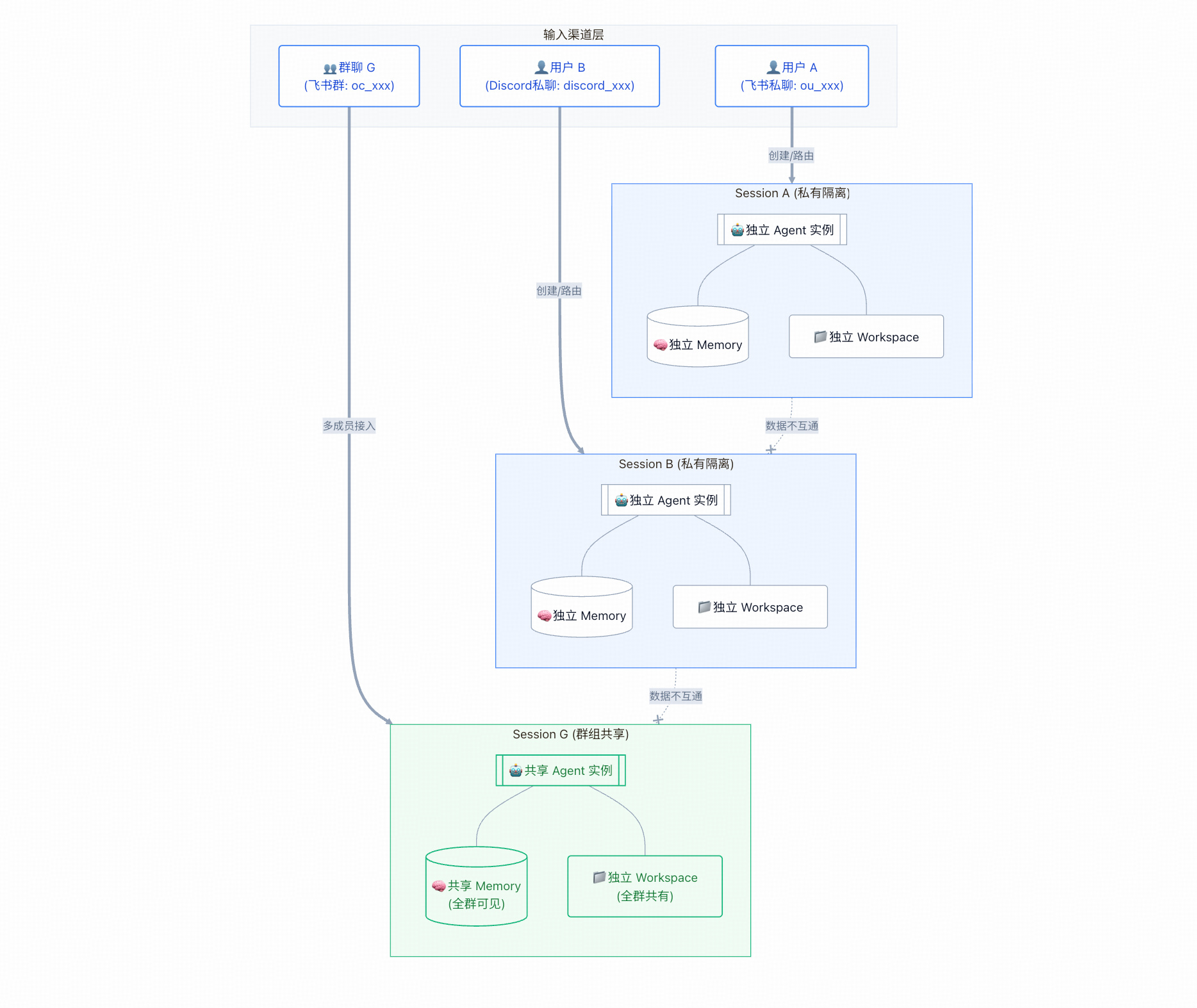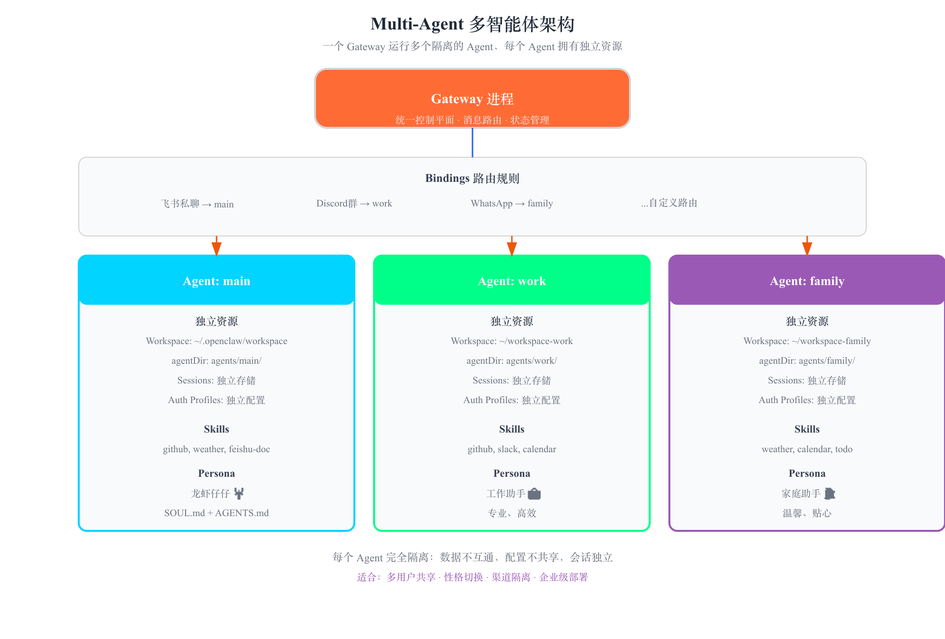 | 渠道隔离 | 飞书Agent(企业)vs WhatsApp Agent(个人) |