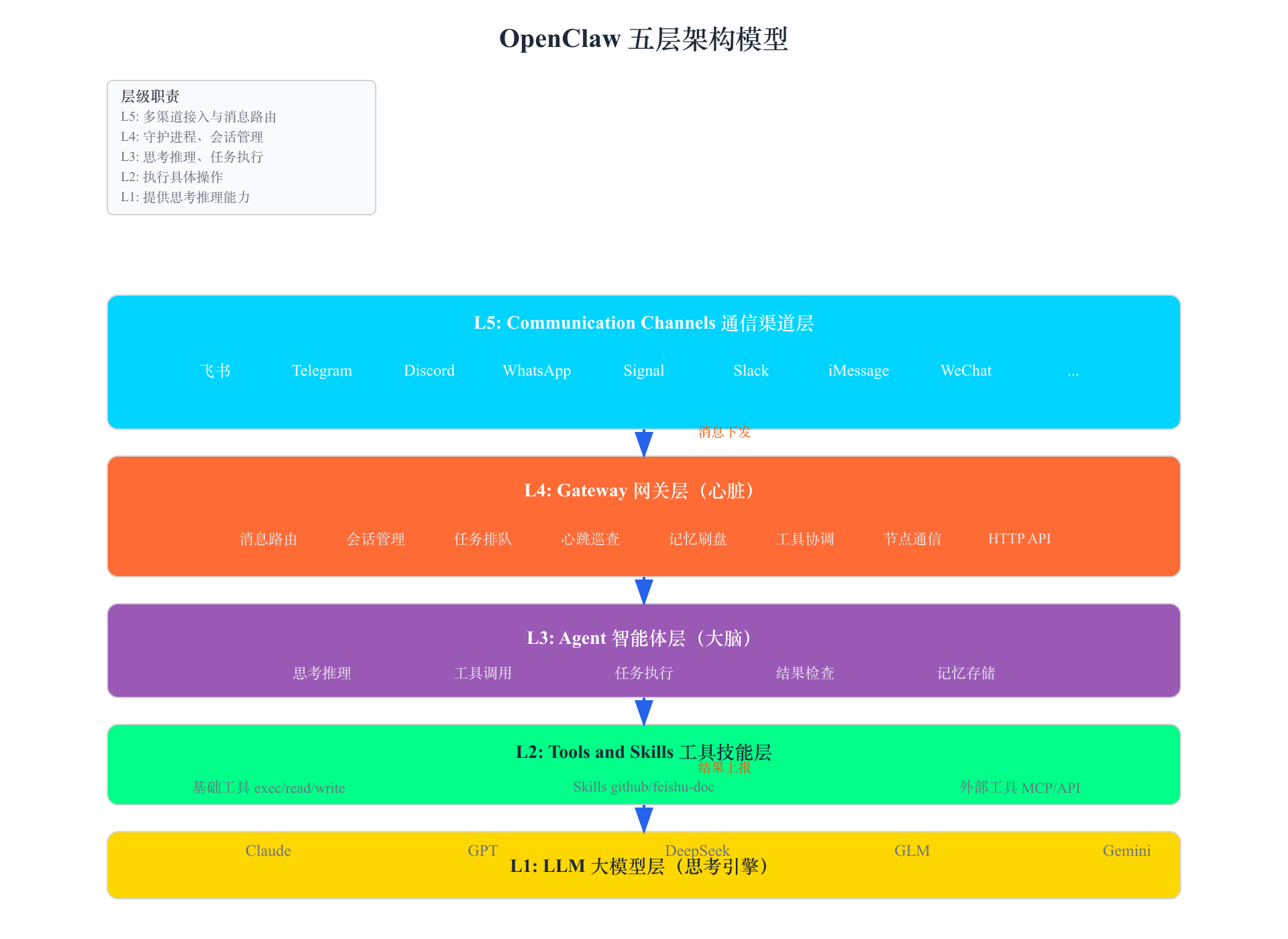 | L5 | Communication Channels | 多渠道接入与消息路由 | Provider插件、WebSocket连接 | 各渠道自有协议 |