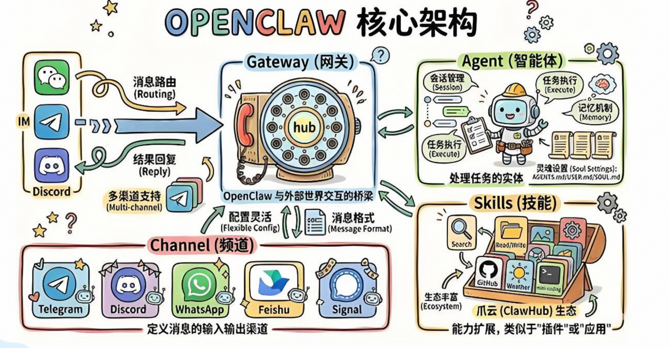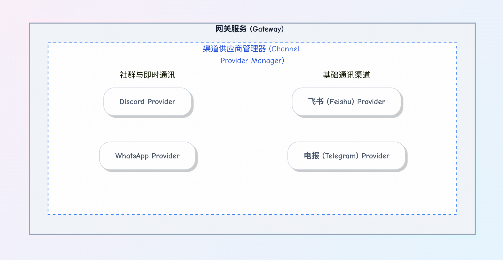 | 接入渠道 | Web/App单一渠道 | 飞书/Telegram/Discord等25+渠道 |