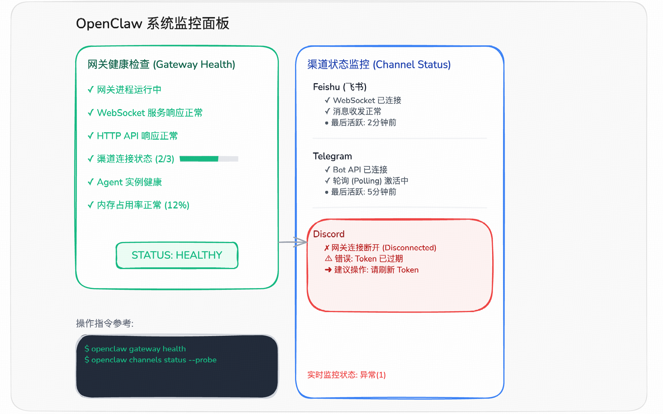 | 渠道连接失败 | Token错误/网络问题 | openclaw channels status --probe | 更新Token、检查网络 |