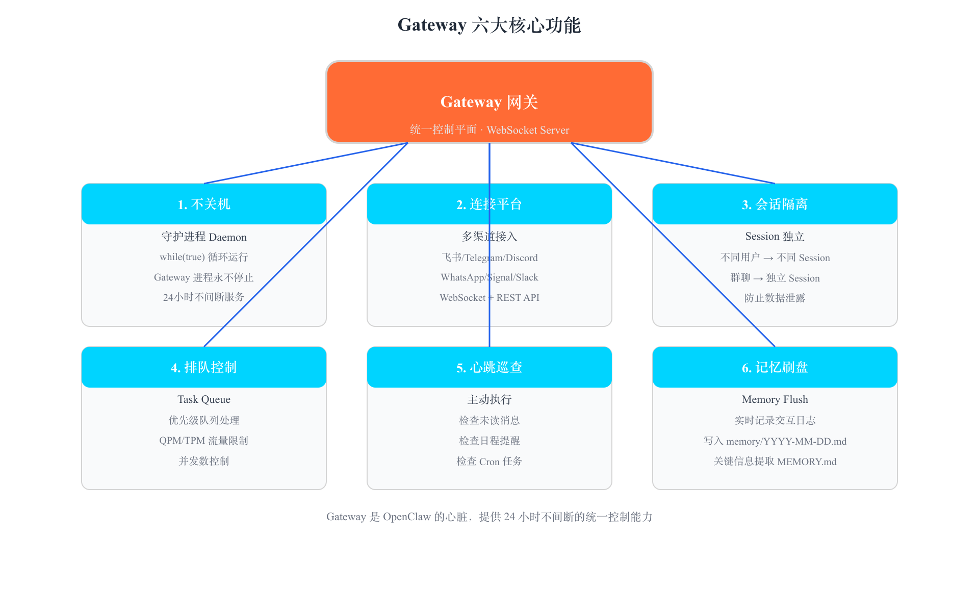 | 网关 | 统一控制平面,永不关机 | Gateway守护进程 |