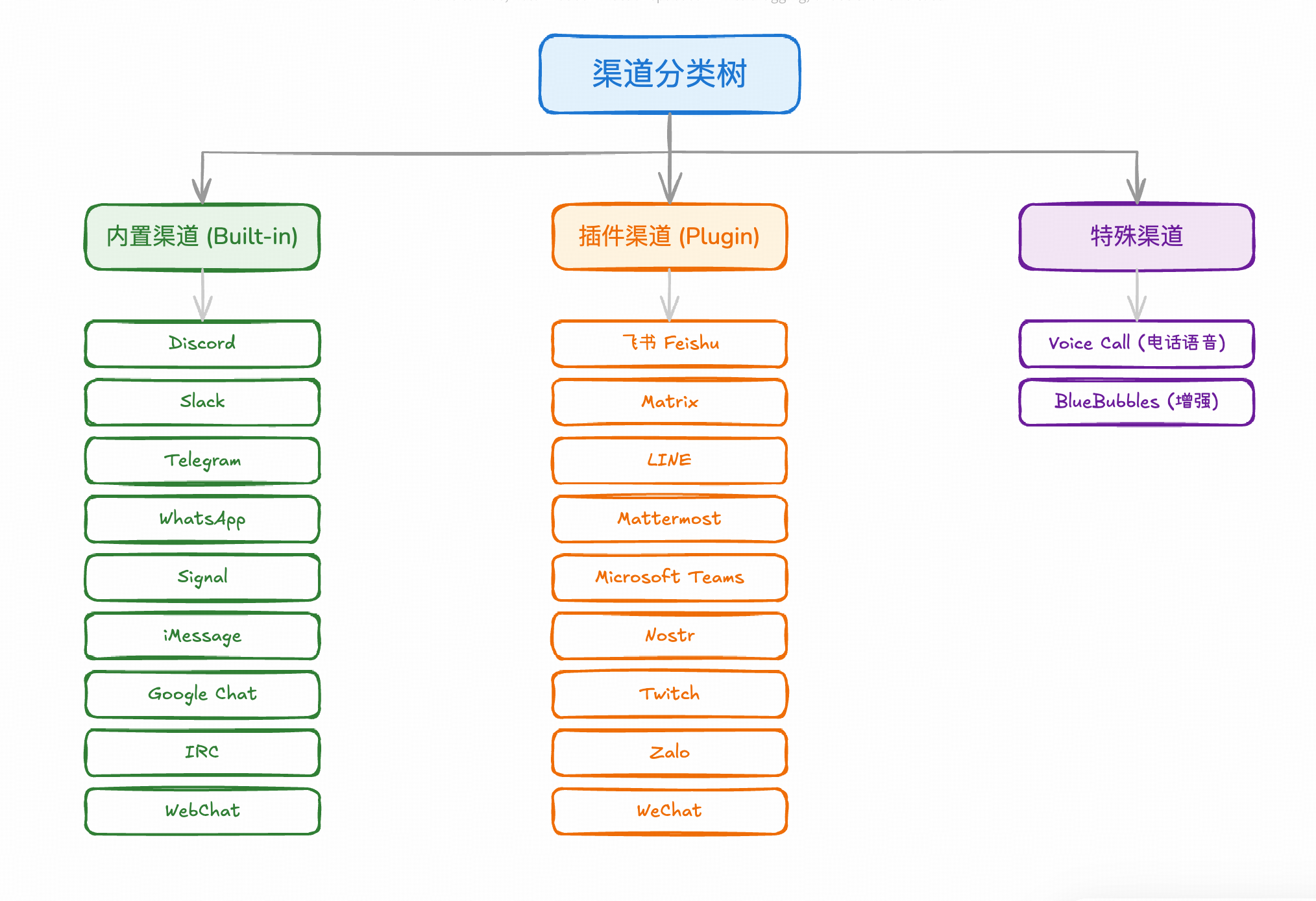| 多渠道 | 支持25+聊天应用 | Channels系统 |