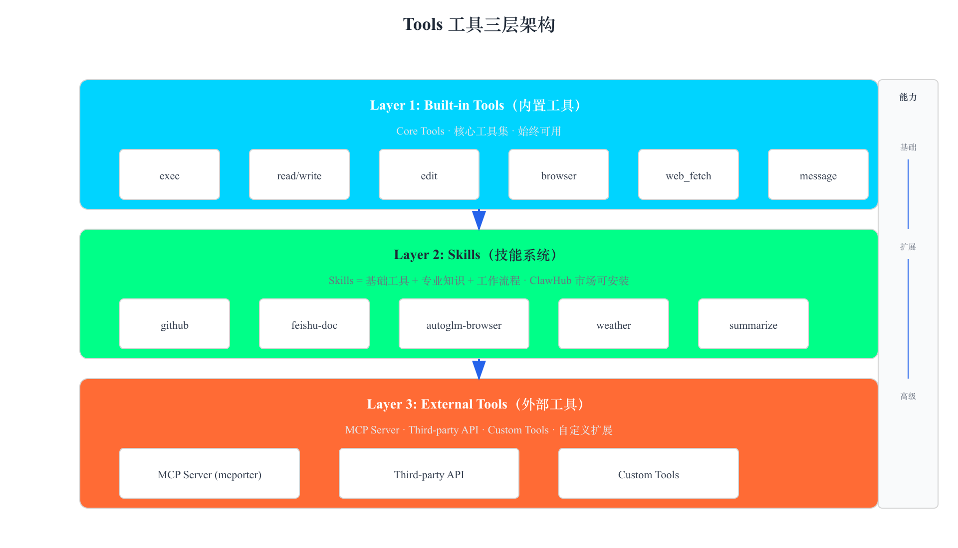 | 能力受限 | 只能对话,不能执行 | Tools + Skills,真实执行 | 真干活、有产出 |