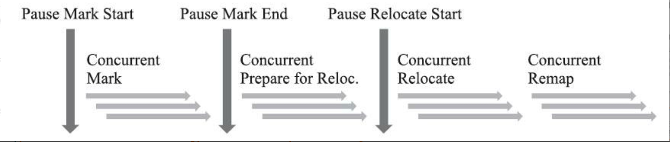ZGC的运作过程大致可划分为以下四个大的阶段。全部四个阶段都是可以并发执行的,仅是两个阶段中间会存在短暂的停顿小阶段。这四个阶段分别为:并发标记(Concurrent Mark)、并发预备重分配( Concurrent Prepare for Relocate)、并发重分配(Concurrent Relocate)、并发重映射(Concurrent Remap)。