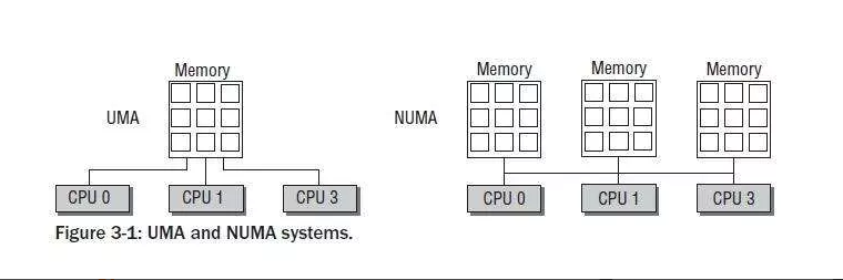 在UMA中,各处理器与内存单元通过互联总线进行连接,各个CPU之间没有主从关系。之后的X86平台经历了一场从“拼频率”到“拼核心数”的转变,越来越多的核心被尽可能地塞进了同一块芯片上,各个核心对于内存带宽的争抢访问成为瓶颈,所以人们希望能够把CPU和内存集成在一个单元上(称Socket),这就是非统一内存访问(Non-Uniform Memory Access,NUMA)。很明显,在NUMA下,CPU访问本地存储器的速度比访问非本地存储器快一些。