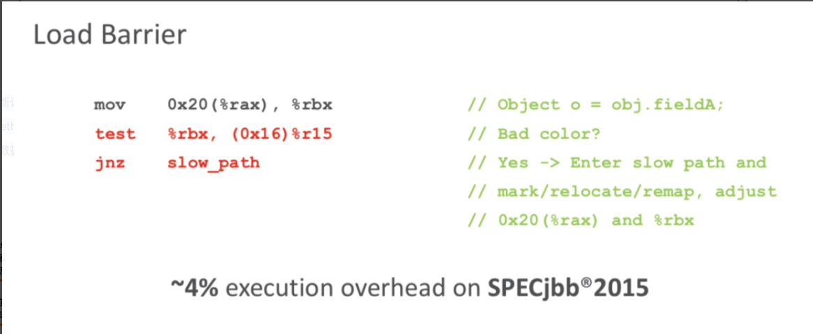 这个动作是不是非常像JDK并发中用到的CAS自旋?读取的值发现已经失效了,需要重新读取。而ZGC这里是之前持有的指针由于GC后失效了,需要通过读屏障修正指针。后面3行代码都不需要加读屏障:Object p = o这行代码并没有从堆中读取数据;o.doSomething()也没有从堆中读取数据;obj.fieldB不是对象引用,而是原子类型。正是因为Load Barriers的存在,所以会导致配置ZGC的应用的吞吐量会变低。官方的测试数据是需要多出额外4%的开销: