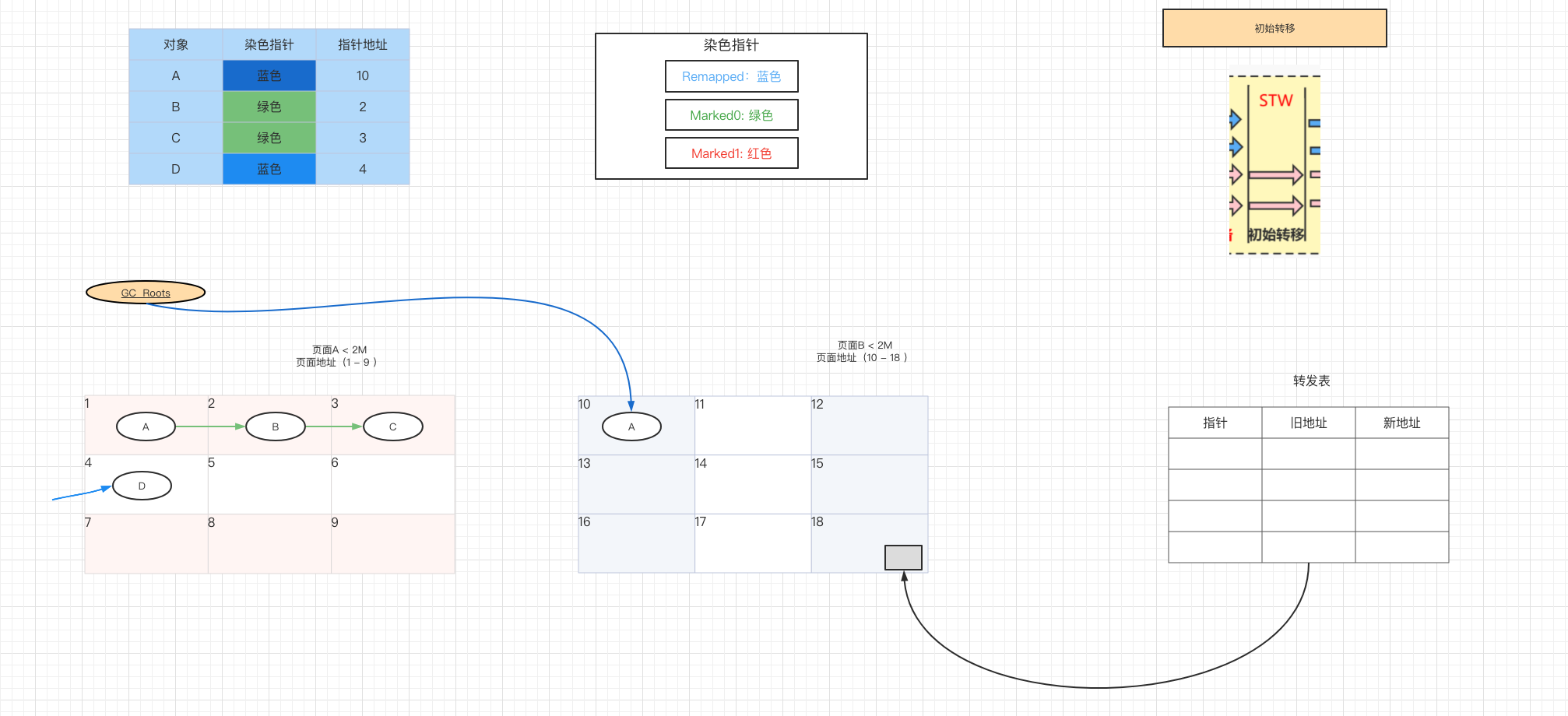 需要转发表 类似于hashmap , 在转移对象时同时插入转发表数据 该操作为原子操作转发表(类似于HashMa