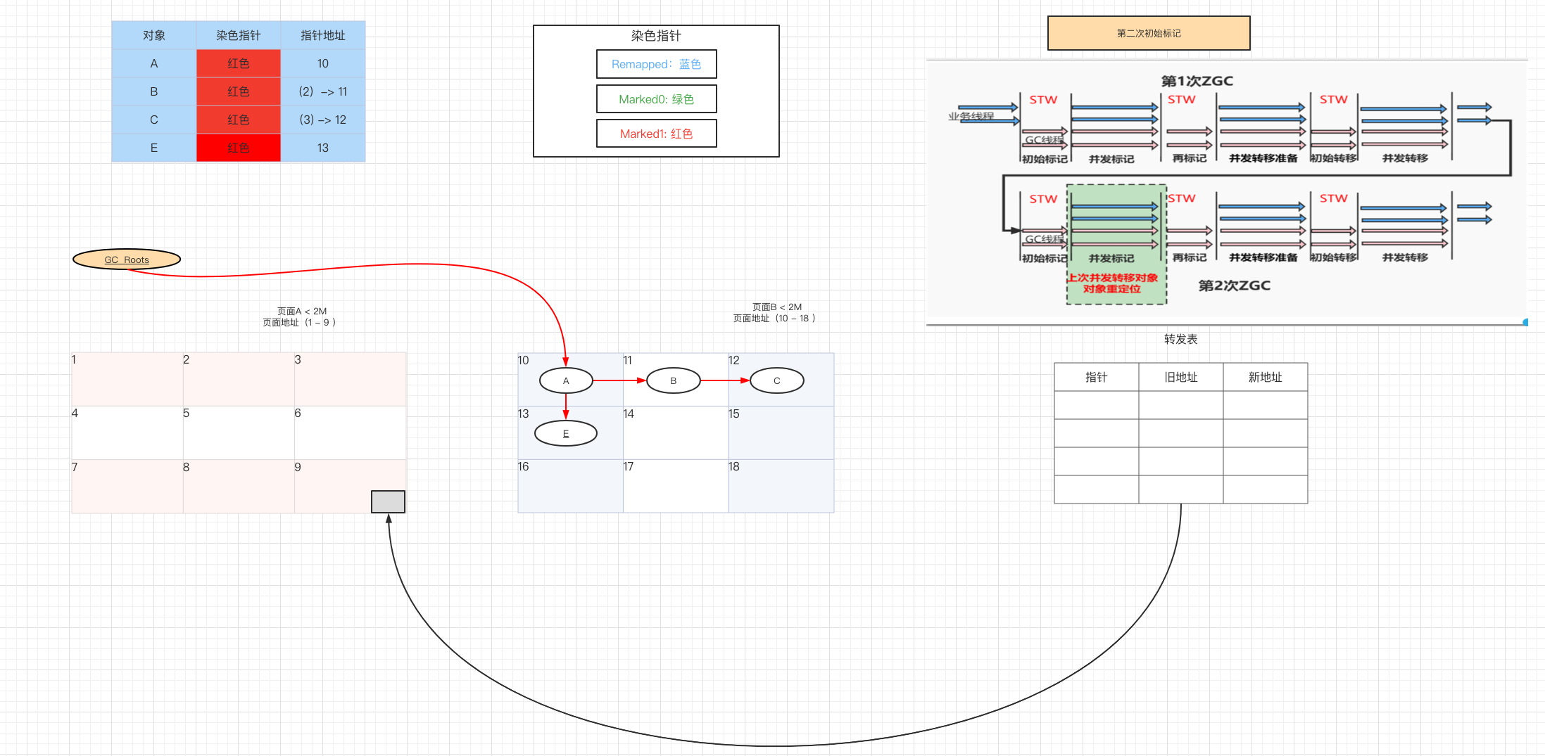 第二次GC: 修正指针地址并且删除转发表 修改染色指针为红色