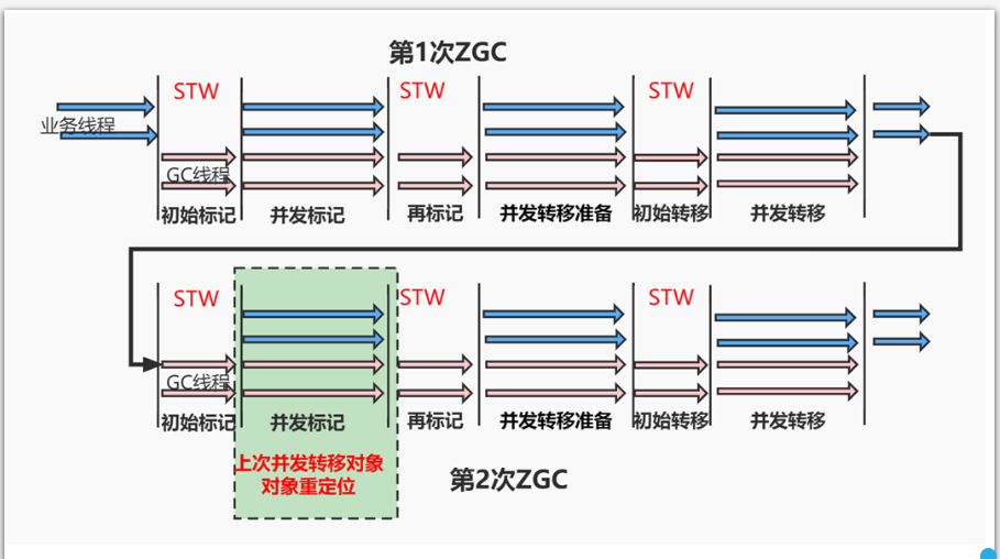 重映射所做的就是修正整个堆中指向重分配集中旧对象的所有引用,但是ZGC中对象引用存在“自愈”功能,所以这个重映射操作并不是很迫切。ZGC很巧妙地把并发重映射阶段要做的工作,合并到了下一次垃圾收集循环中的并发标记阶段里去完成,反正它们都是要遍历所有对象的,这样合并就节省了一次遍历对象图的开销。一旦所有指针都被修正之后, 原来记录新旧对象关系的转发表就可以释放掉了。(第二次GC)